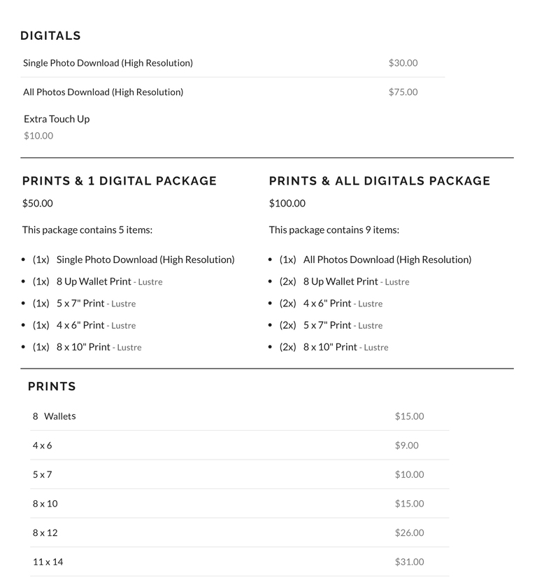 Good bye to packages that pressure you to pay more for what you don’t need. As a mom of 2 toddlers, I get it… we all want the high resolution digitals with the ease and flexibility to print and frame after. I also offer a variety of a-la-carte printed products and packages.
